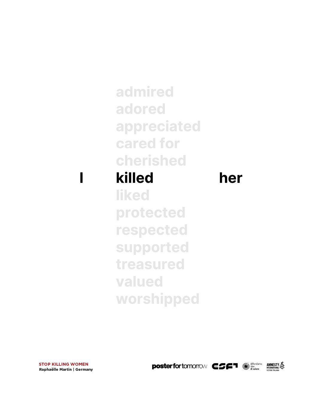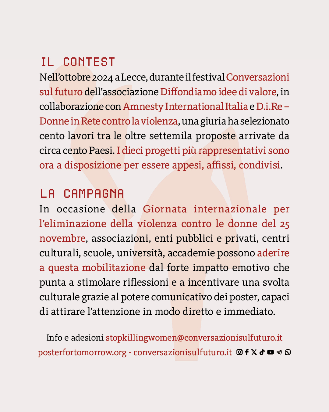 Adesione alla campagna di sensibilizzazione “STOP KILLING WOMAN – BASTA UCCIDERE LE DONNE”, promossa da Poster for Tomorrow in collaborazione con Diffondiamo idee di valore, Conversazioni sul Futuro ed Amnesty International.