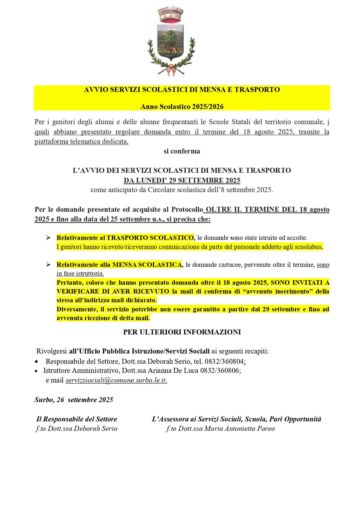 AVVIO SERVIZI SCOLASTICI DI MENSA E TRASPORTO anno scolastico 2025/2026